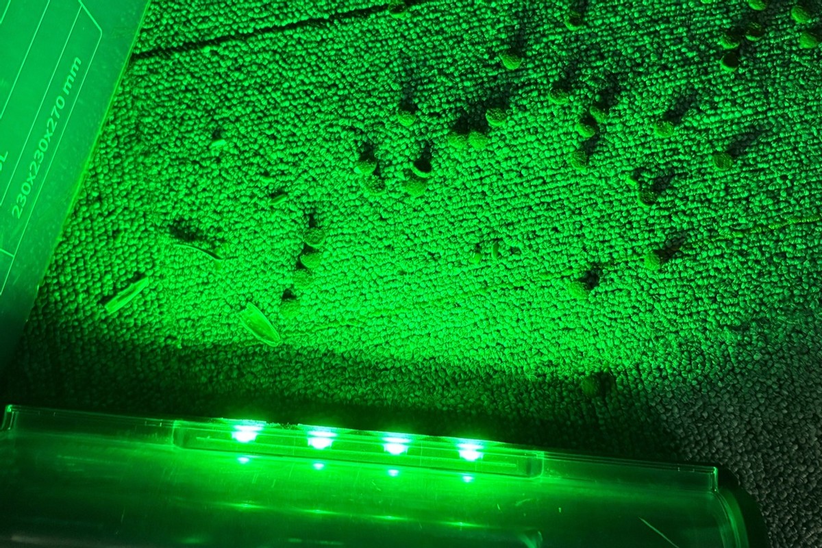 普通室内照明是从上往下的,地面上的灰尘很难形成阴影,肉眼看着干净,其实全是死角。很多老款机器为了省成本不加显尘灯,或者只加个没什么用的照明灯。现在主流的绿光显尘技术,是利用光的折射原理让灰尘显形。没有这个功能,吸地就像盲人摸象,不仅效率低,还容易漏吸,清洁效果大打折扣。