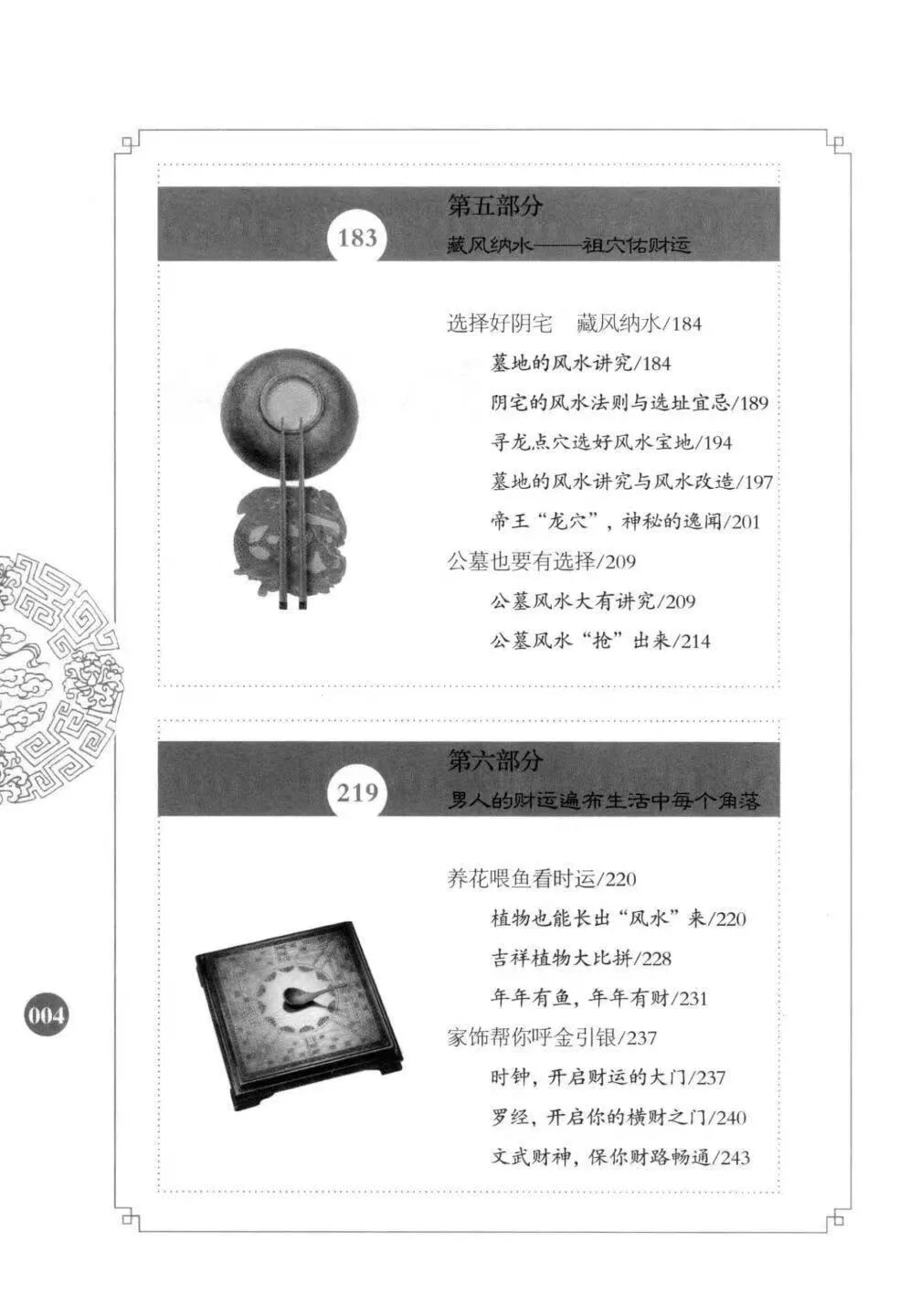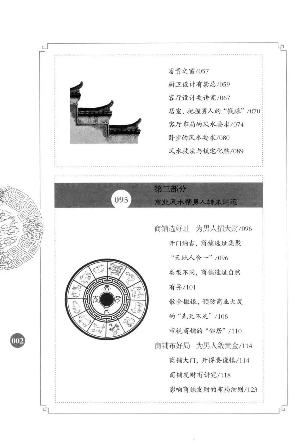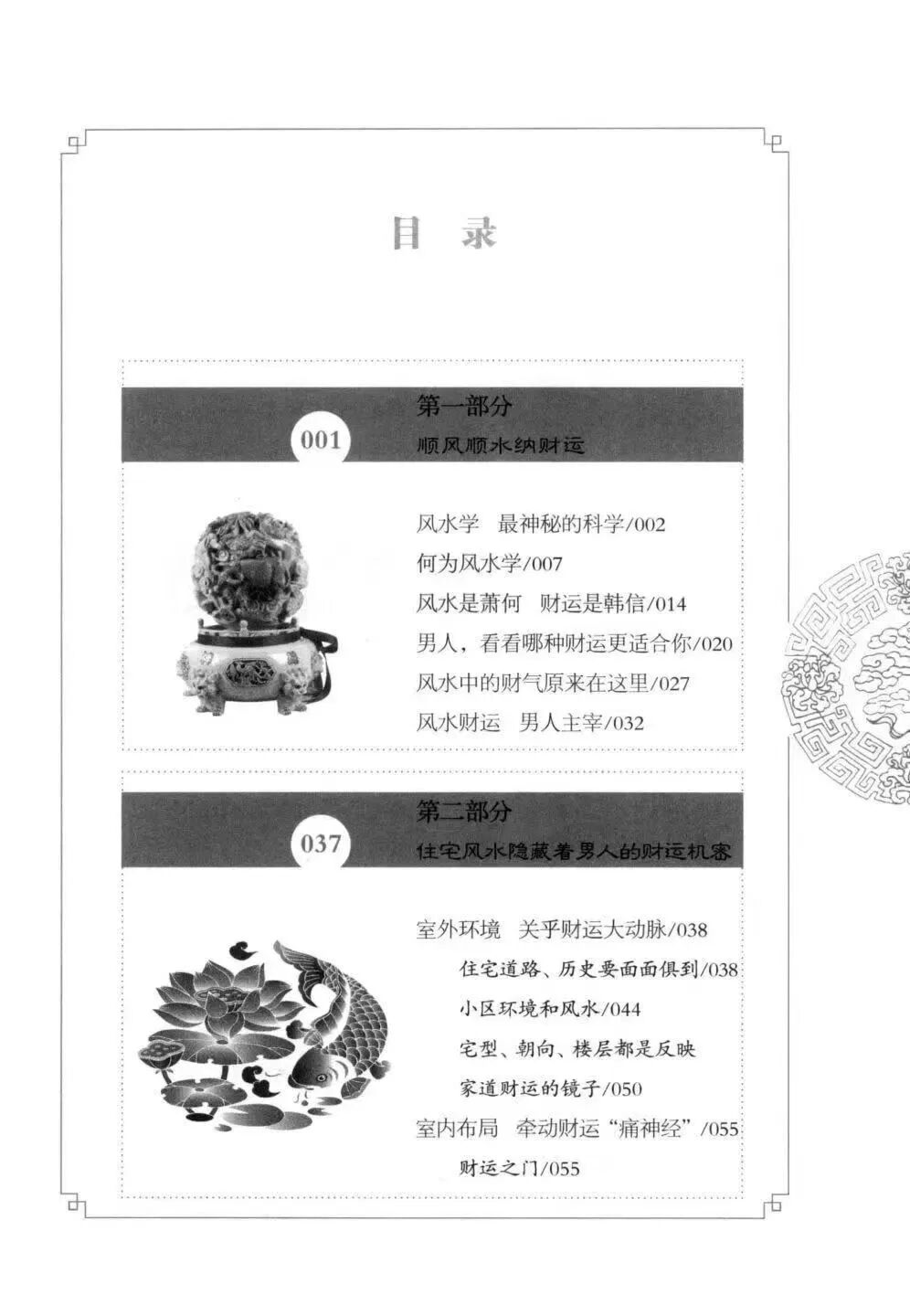 该书最鲜明的特质,是精准契合男性气场与财运需求,打破通用风水的模糊性,实现“针对性招财”。不同于普通风水书籍的泛泛而谈,书中结合男性“阳刚气场”特质,区分职场正财、经商偏财、投资暗财等不同财运类型,提供差异化布局方案。上册聚焦基础认知,详解男性命理与五行财运的关联,教读者根据自身八字判断财位适配性,如乾命男性宜强化西北乾位气场,坤命男性需兼顾西南坤位与正东震位,同时拆解明财位、流年财位的精准定位方法,筑牢招财根基。