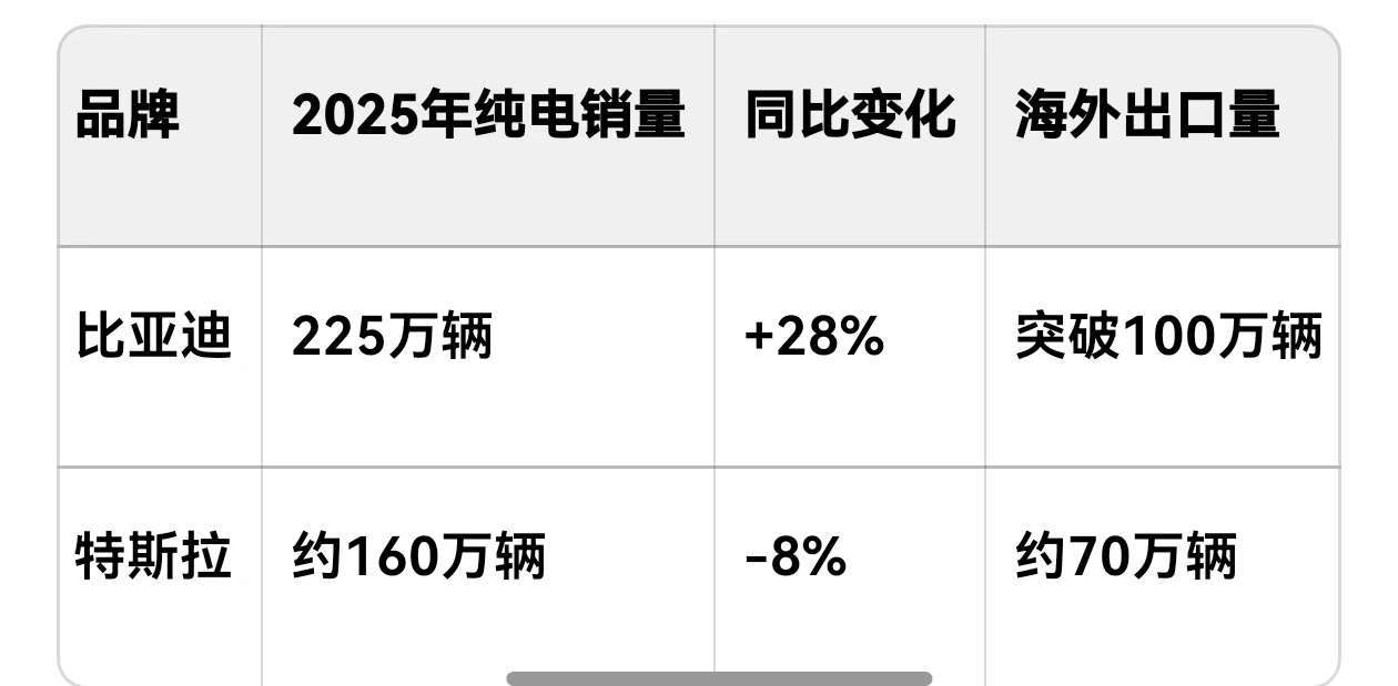 喜大普奔,全球电动车销冠易主了!比亚迪2025年纯电销量干到225万辆,首次超过特斯拉(预计全年160万辆),直接登顶全球纯电车销冠——这波操作把“中国智造”的牌面拉满了!
