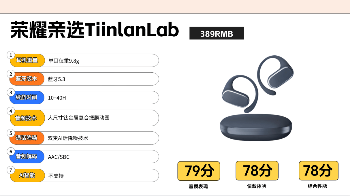 荣耀亲选TiinlanLab耳机采用一体式耳挂结构,设计简洁但佩戴时可能存在明显的压迫感,耳机搭载13.4mm钛金属振膜动圈单元,声音风格追求高解析与速度感,高频明亮有力,细节清晰。但低频表现偏硬,人声稍显冷静,整体听感更适合电子乐等节奏明快的曲风,在音乐适应性上具有一定局限性。