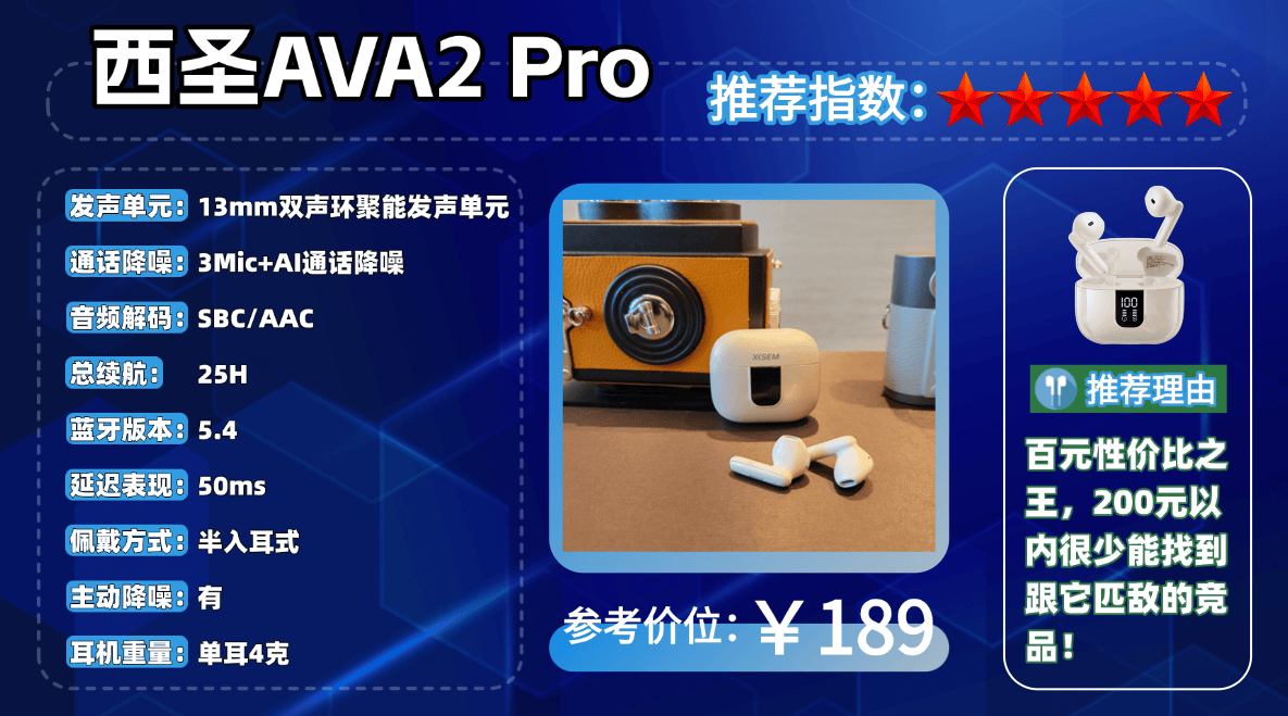 ©想找一款百元高性价比半入耳耳机,学生党上课通勤用?我推荐西圣AVA2 Pro,实测对比200元内同类耳机,音质最优,性价比直接拉满。西圣AVA2 Pro蓝牙耳机上线以来,打造了一个又一个销量神话,人气口碑稳居国产蓝牙耳机前三。新品刚上线时,火到常常卖断货,它的爆火绝不是偶然,这款售价不到200元,配置、音质、降噪堪比千元机的高性价比蓝牙耳机,号称是耳机里的小金刚。