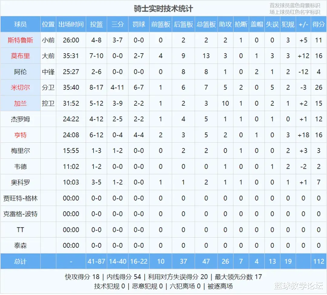 骑士这边,米切尔13分3板4助、莫布利12分7板、亨特8分3板。亨特补强了骑士3号位的短板,让球队实力又上了一个台阶。下半场开始,乐福连得5分,热火追平了。骑士今天有点松懈,面对残阵热火,没能打出联盟第一的统治力!