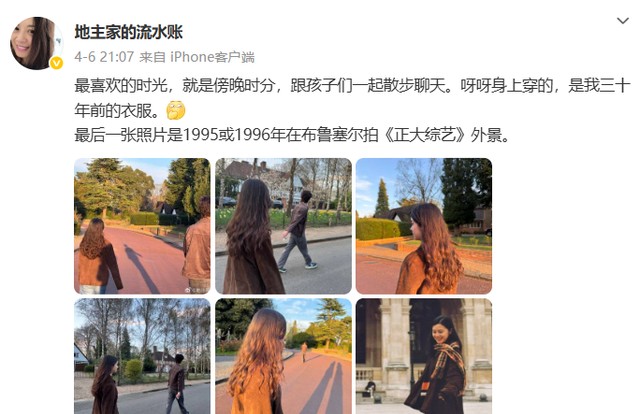 在四月六号,她在社交平台上发布了一条最新的动态,是一组孩子们和三十年前她自己的照片。