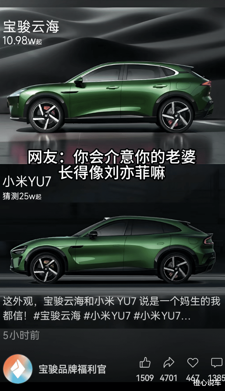 昨晚看到一个挺有意思的现象:小米YU7刚发布完,宝骏就迫不及待地发视频说"我们长得像双胞胎"。我当时就想,这不就是传统车企面对新势力时的"流量焦虑症"的典型表现嘛。
