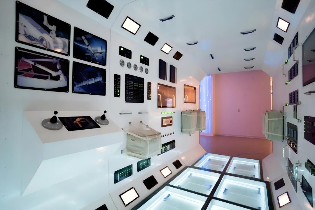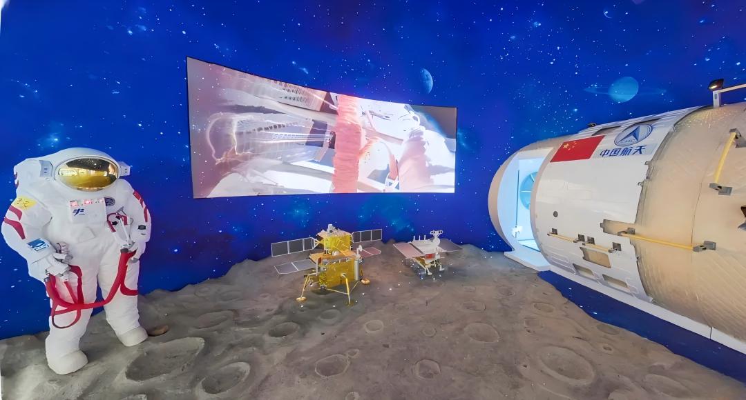 航空航天通过沉浸式场景的打造营造漫游太空的景象,地面模拟真实的月球表面,参观者可以走进太空舱,可以站在航天服后进行拍照留念。在了解氟硅材料在航空航天领域的应用同时增强展厅的趣味性。