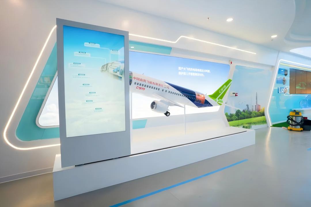 在飞机领域通过飞机模型结合透明滑轨屏的形式展示氟硅材料在飞机上的应用。