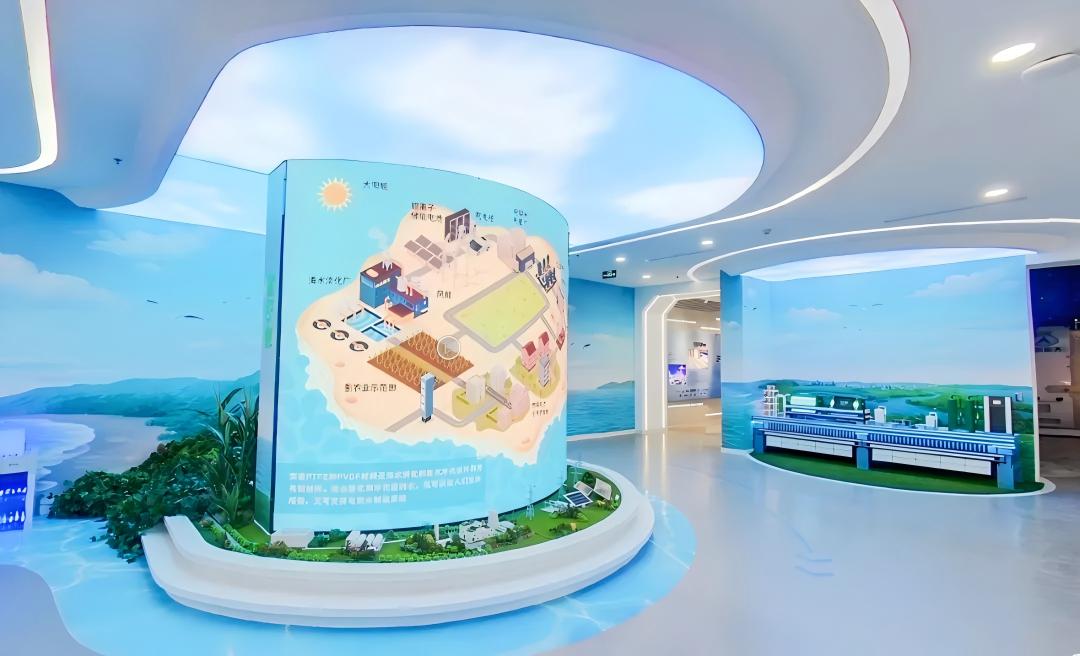 通过视频或者模型展示氯碱离子膜在电解槽当中的应用:所产生的工业废氢—输送到废氢回收和提纯—提纯后的氢气—输送到加氢站。同时以半景画结合模型沙盘、互动装置打造打造一个有山、有水、有海、有工业园(工业园里有氯碱车间,氯碱车间里有氯碱槽),有工业废氢收集和提纯区域,有水电解制氢装置区域,有生活区域的一幅清新自然的滨海氢城美丽画卷。