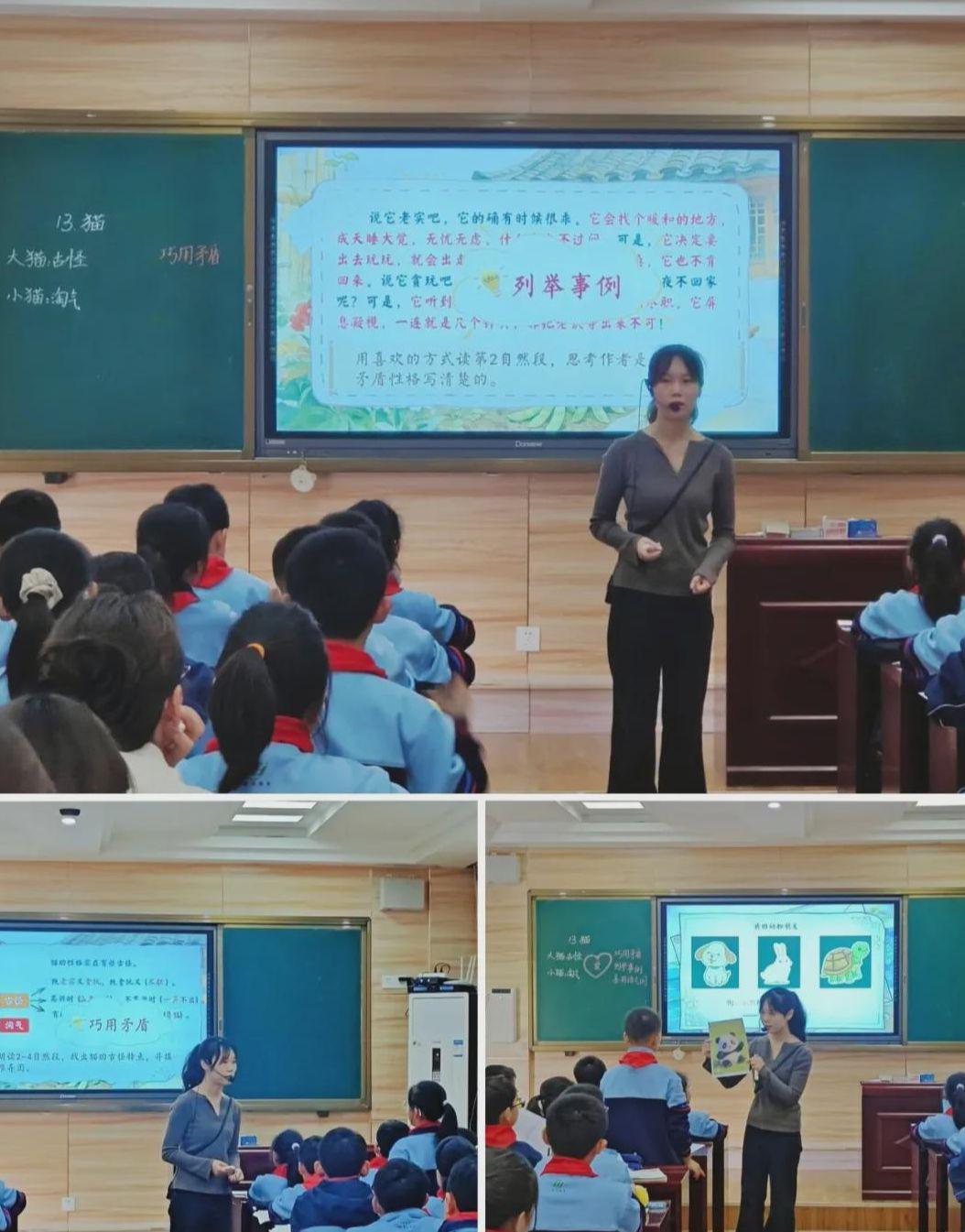 来自浉河区第一小学的曹金萍老师执教了四年级下册《猫》,精准把握四年级学生的认知规律,创设了“金牌讲解员成长营”这一生动情境,极大激发了学生的学习兴趣。她以“巧用矛盾、列举事例、善用语气词”为核心教学线索,引导学生层层深入品读文本,感受老舍先生笔下猫的古怪与可爱。课堂最后,曹老师自然延伸至习作小练笔,实现了阅读与表达的无缝衔接。学生在情境中积累语言,在品读中习得方法,在练笔中迁移运用,整堂课流畅自然,趣味与深度兼备。