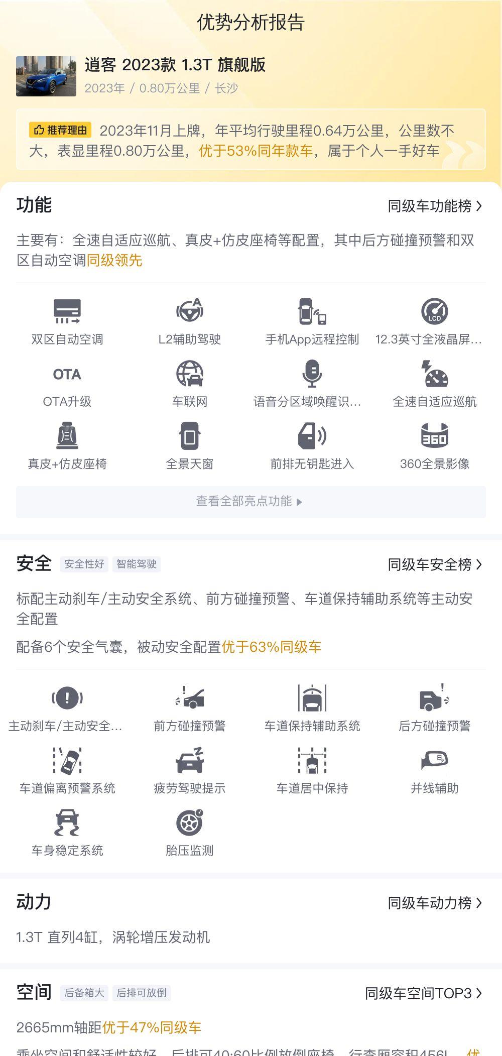 我们先来看看这辆车的基本情况。2023年11月上牌,行驶里程8000公里,相当于新车磨合期刚过。车源地和上牌地都在长沙,没有过户记录,看起来车况比较简单。外观是比较少见的蓝色,增添了几分时尚感。从这些信息来看,似乎没有什么明显的硬伤。