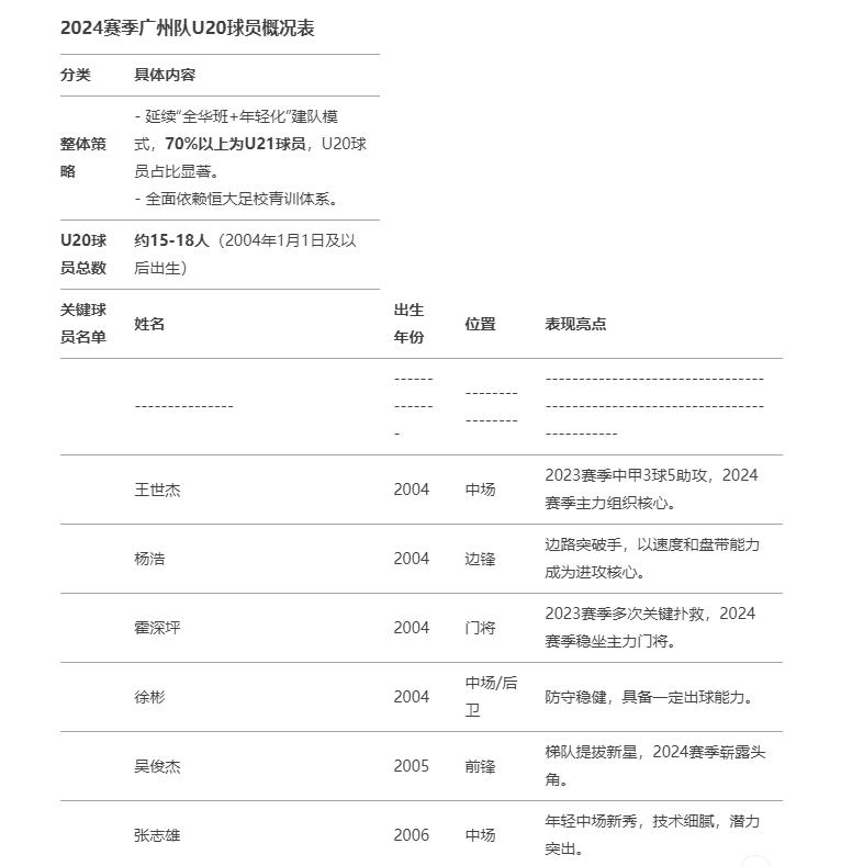 2024赛季,广州队在引进3名外援之后,更加是将年轻二字坚持到底。该赛季,广州队启用多达18名U20的球员,甚至出现17岁的白余涛和张志雄等球员。U20的球员代表广州队出战占比高达80%,阵容极度年轻化释放强大的潜力。