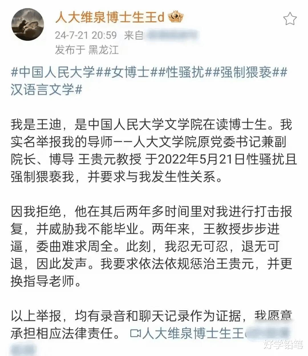 7月21日,博士生王迪在社交媒体上发表声明,指控王贵元教授于2022年5月31日对她进行性骚扰和强制猥亵,并要求发生性关系。此事在网络上引发了广泛的讨论和关注。
