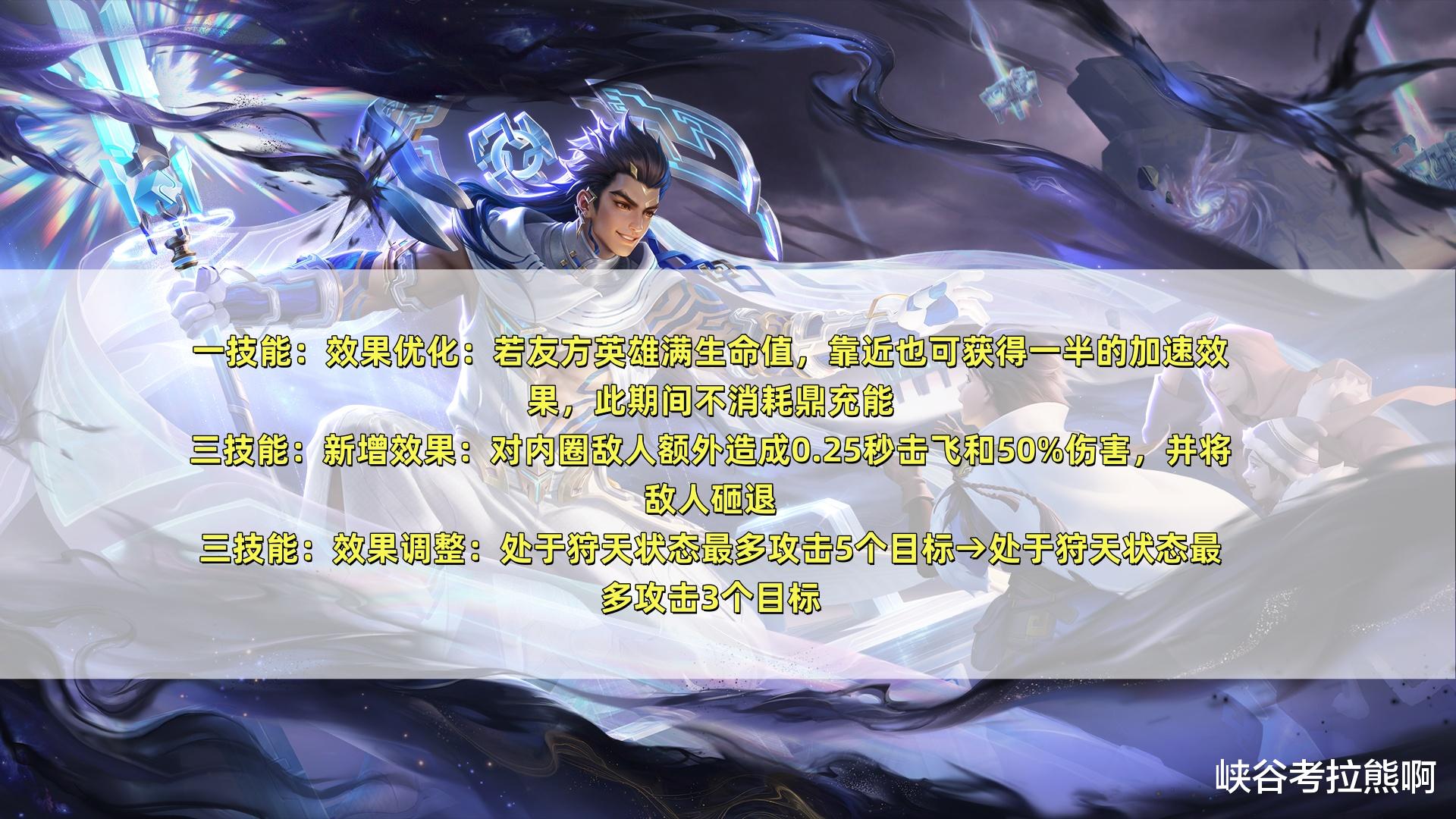 一技能优化加强,若我方英雄处于满生命状态,靠近鼎也可以获得一半的加速效果,且不消耗鼎充能。而大招新增了对圈内敌人造成额外0.25秒击飞效果和50%伤害,并将敌人砸退的调整,属于明显的控制效果提升。