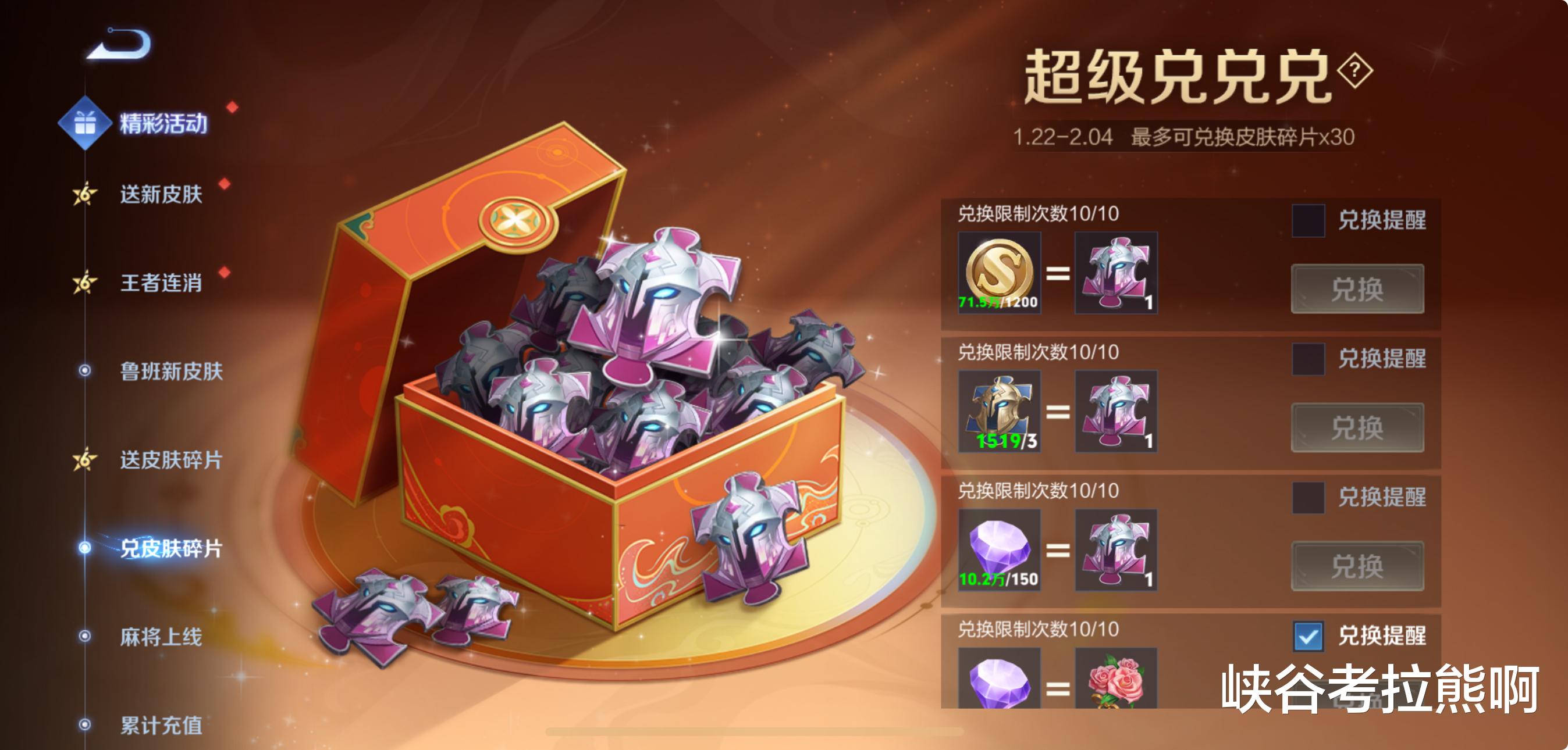 第二个活动叫【超级兑兑兑】,15000金币可兑换10个皮肤碎片,30个英雄碎片可兑换10个皮肤碎片,1500钻石可兑换10个皮肤碎片,总计30个皮肤碎片,太划算了!