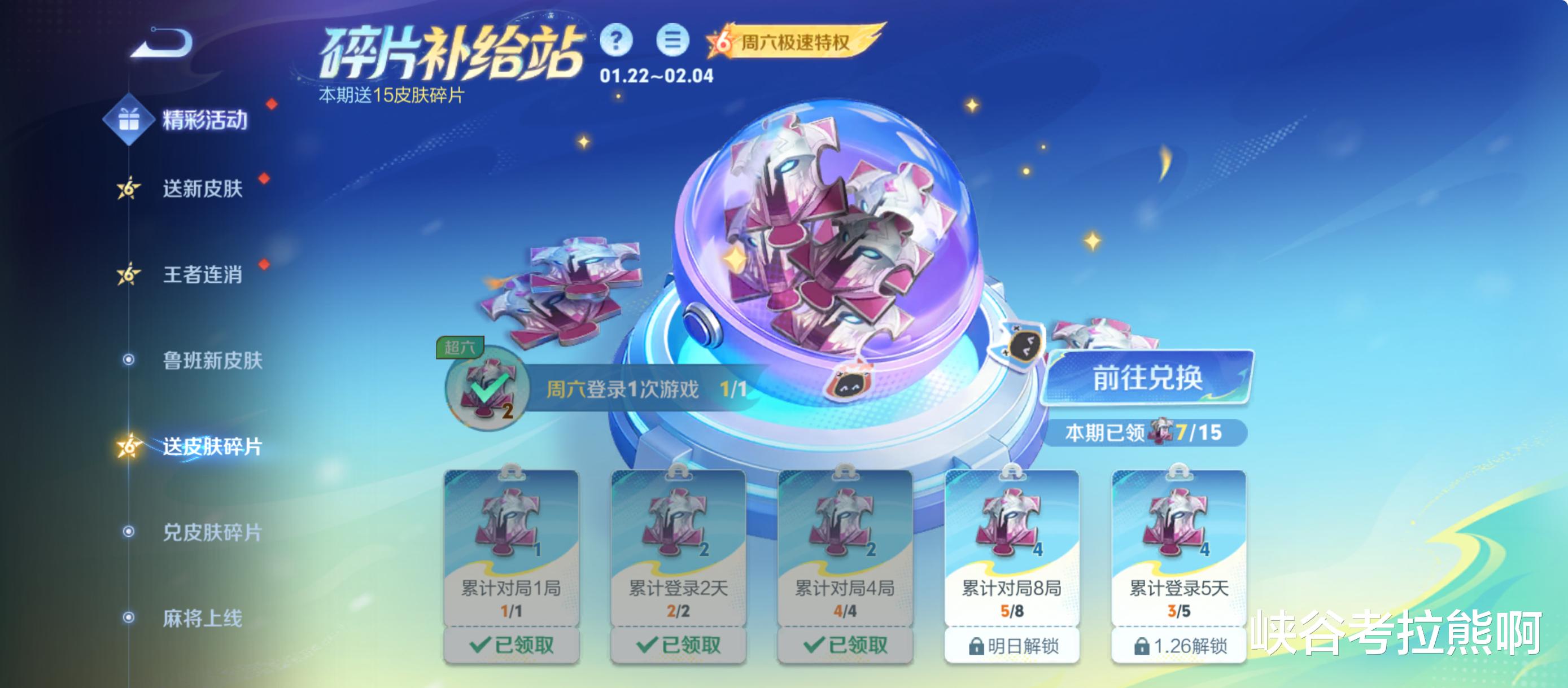 第一个活动叫【碎片补给站】,1月22日到2月4日之间,只要完成累计8次对局和5天登陆,即可获得15个皮肤碎片。