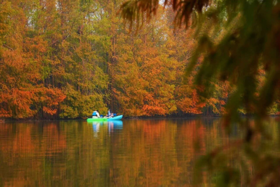 第一抹红已悄然染上枝头,站在木栈道上眺望,挺拔的水杉林褪去夏日的青翠,树梢泛起淡淡的橙红,倒映在碧波荡漾的湖面,像一簇簇温暖火焰,点燃了湖畔水岸。园内20万株左右的杉树穿上金黄色的外衣,构成一幅绝美的秋日美景,从11月下旬开始由绿至黄直至呈深红色,坐船进入红杉林,享受深秋享受恬静。“红叶平台”是观赏红杉林最好的点位之一,如果您不想坐船游览,走上木栈道近距离观赏红杉也是一个不错的选择。海湾森林作为上海市宠物友好公园,秉持着视宠物为家人的观念,所有室外游玩项目,在确保宠物自我意愿游玩和安全的情况下,都可一起游玩。