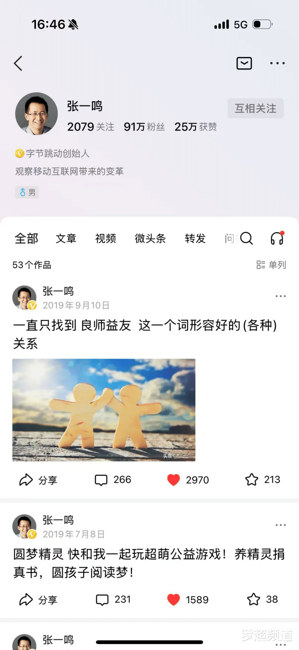 在今日头条,张一鸣多年前关注了一些创作者,也是与我互关的“粉丝”,他偶尔也会更新一下微头条。只是随着业务重心的转变,张一鸣今日头条早已停更,留下的只有供人们“考古”的少量内容。