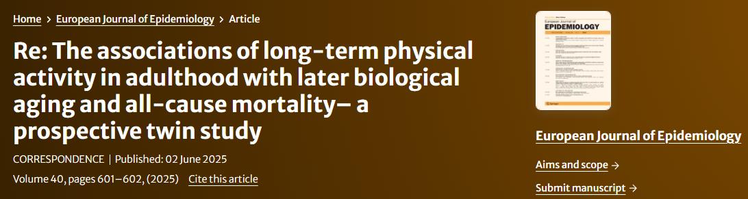 [2]Zhang, Y., Giovannucci, E.L. Re: The associations of long-term physical activity in adulthood with later biological aging and all-cause mortality– a prospective twin study. Eur J Epidemiol 40, 601–602 (2025). doi:10.1007/s10654-025-01255-4