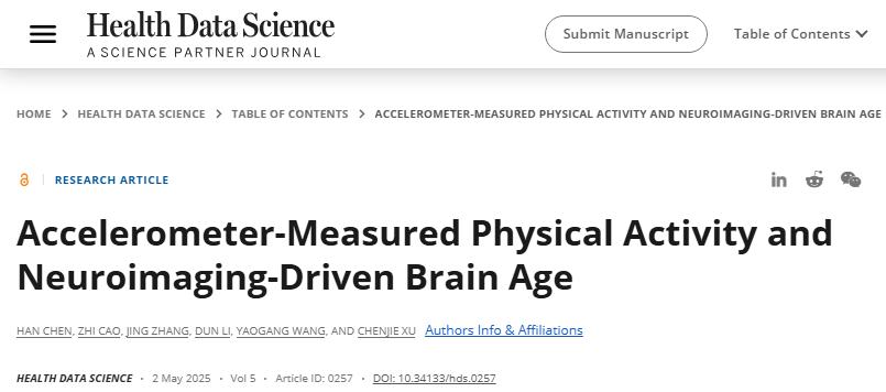 [1]Han Chen,Zhi Cao, Jing Zhang,Dun Li,Yaogang Wang,Chenjie Xu.Accelerometer-Measured Physical Activity and Neuroimaging-Driven Brain Age. Health Data Sci. 2025;5:0257.DOI:10.34133/hds.0257
