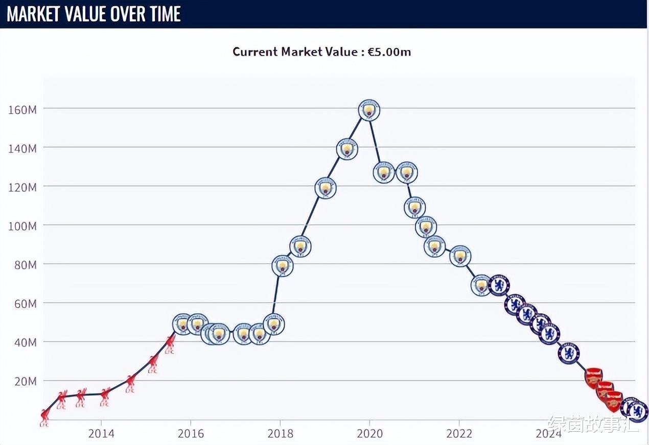 近几年的低迷表现,也让斯特林的身价直线下滑,在比较权威的身价网站《德国转会市场》的最新统计中,斯特林的最新身价已经跌至500万欧元。要知道在斯特林的巅峰期,身价可是达到过1.6亿欧元,那时的他就是最顶级的球员之一,整个世界足坛身价比他更高的球员只有姆巴佩和内马尔。但是在短短6年后,他的身价就足足缩水了32倍,从万人追捧的明星,变成了无球可踢的弃子。