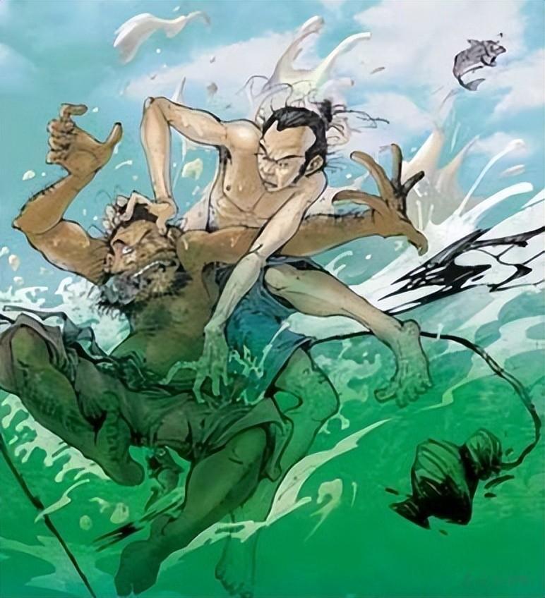 这只是他在日常打架时展现的能力,尚且没有用全力。而在生死时刻,张顺的水性会更加恐怖:梢公在船舱里取缆船索,轻轻地把张顺捆缚做一块,便去船梢艎板底下取出板刀来。张顺却好觉来,双手被缚,挣挫不得。梢公手拿大刀,按在他身上。张顺道“好汉,你饶我性命,都把金子与你。”梢公道“金银也要,你的性命也要。”张顺连声叫道“你只教我囫囵死,冤魂便不来缠你。”梢公放下板刀,把张顺扑咚的丢下水去。却说张顺是在水底下伏得三五夜的人,一时被推下去,就江底下咬断索子,赴水过南岸时,见树林中闪出灯光来。张顺爬上岸,水渌渌地转入林子里看时,却是一个村酒店。
