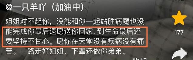 姐,我真的很抱歉,没能陪你打败病魔,也没能帮你回家。你最后一程那么辛苦,我真的不甘心。希望你在天堂能远离痛苦,没有病痛。姐,你走好,期待来生我们能再做姐弟。