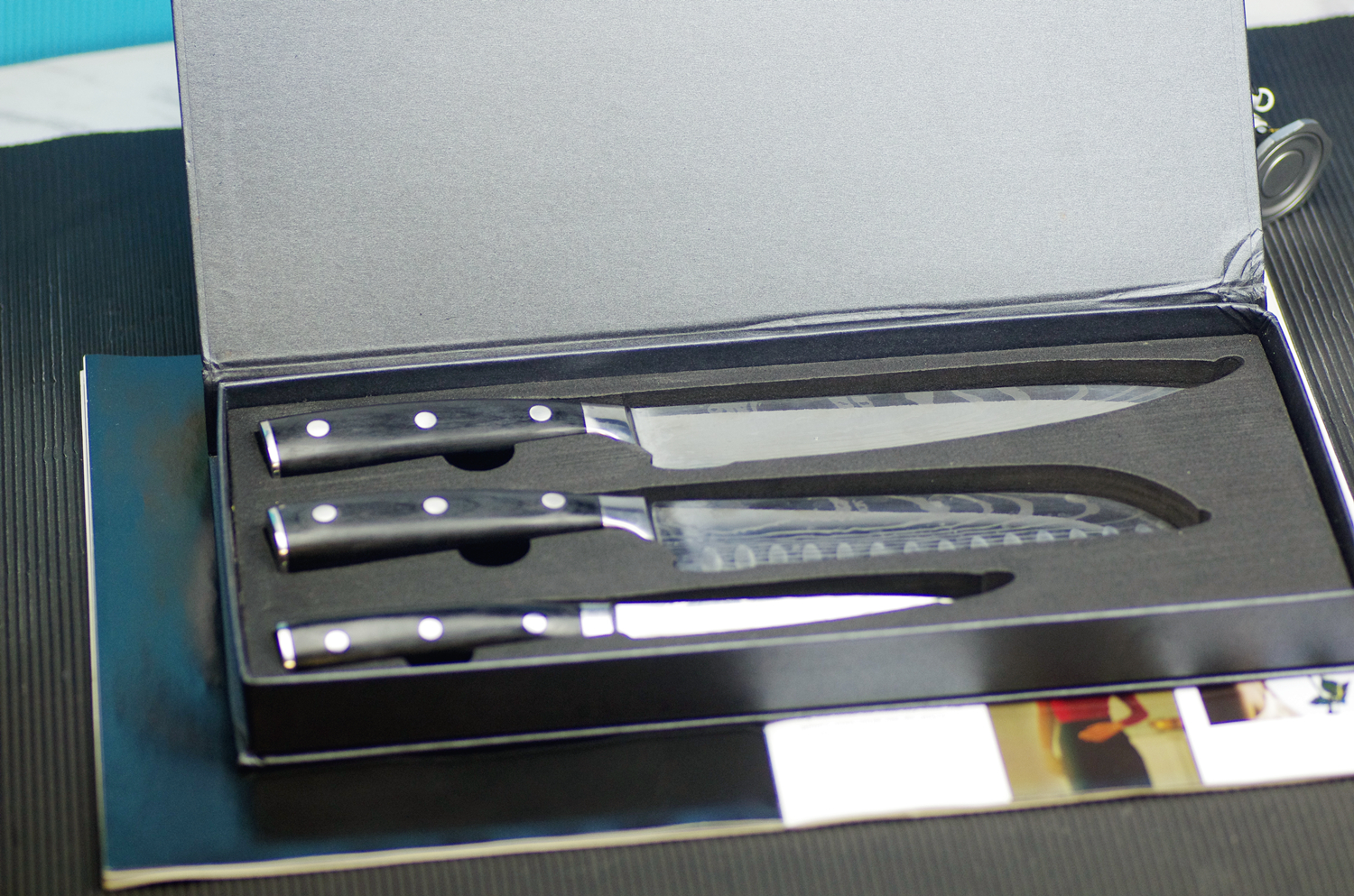 打开盒盖,三把刀具整齐地排列其中,仿佛三位蓄势待发的勇士,随时准备在厨房的战场上大显身手。刀柄采用黑彩木材质,质感细腻,握持舒适,让人不禁想要立即上手体验。