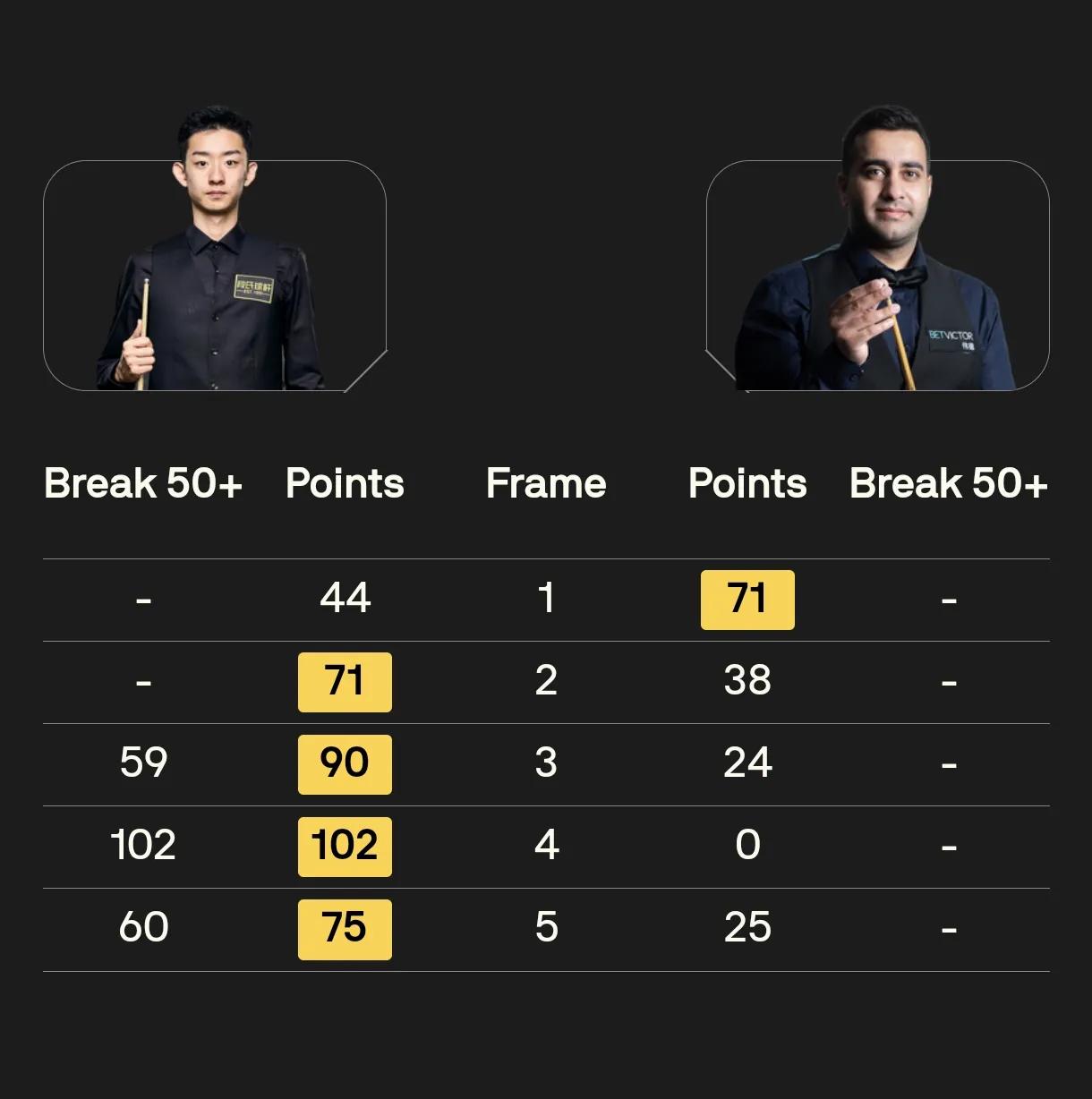 吴宜泽的对手是法拉赫-阿贾布。首局吴宜泽表现不佳,法拉赫阿贾布混乱之中以71-44率先拿下第一局。第二局吴宜泽展开反击,以71-38将比分扳成1-1平。此后吴宜泽越战越勇,第三局单杆轰出59分,以90-24取得大比分2-1领先,第四局更是气势如虹,又是轰出一记102分,零封法拉赫阿贾布。第五局吴宜泽再接再厉,继续神奇表现,再度打出单杆60分,以75-25将对手陷入绝境。最终吴宜泽在先失一局的情况下打出4连鞭,以4-1逆转对手,携手肖国栋晋级32强!