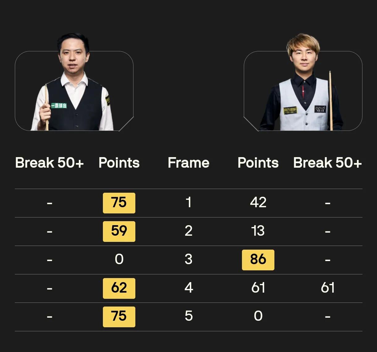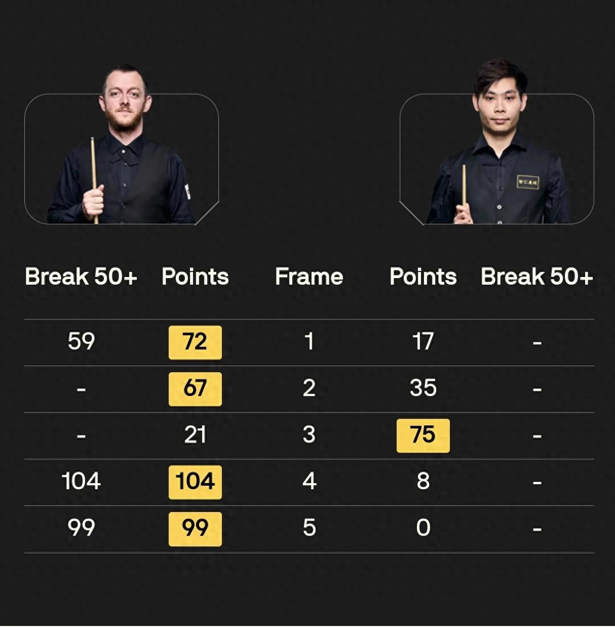 整场比赛,国强都是被动挨打,4号种子马克艾伦在首局便迅速进入状态,单杆轰下59分,以72-17率先取得第一局的胜利。第二局双方打得比较胶着,马克艾伦在混乱中找到机会,再度以67-35以下一城,取得2-0领先。国强在第三局的发挥才稍稍有起色,以75-21扳回一局,将比分追成1-2。此后两局,马克艾伦更是没有给国强任何机会,连续单杆轰出104分和99分,以104-8和99-0两局直落大比分4-1战胜国强,国强无奈止步首轮,惨遭一轮游。