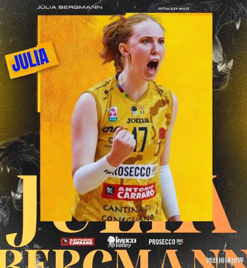 与此同时,球队也在物色新一任强力主攻人选,同一时间土耳其传出消息,巴西国手、现效力于土耳其航空女排的主攻手朱莉娅·贝格曼(Julia Bergmann),已经成为科内利亚诺的重要目标,她在最近一场比赛中独得22分,扣球成功率高达56%,还有1次拦网与2次发球得分,展现出全面的进攻能力。