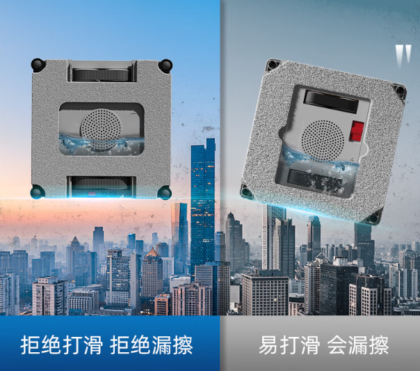 内置还备用电池,在意外断电时,主机能维持吸附状态长达20-30分钟,并发出蜂鸣警报,为用户提供充足的救援时间。物理双保险:标配高强度防脱落安全绳,是最后一道安全保障。故障自检与报警:系统可检测漏气严重、电机过热等故障,并即时停止工作、发出警报。唯一不足的是对于干涸已久、粘附力强的污渍(如鸟粪、水泥点、顽固水垢),仅靠机器人的压力和普通清洁液可能无法一次清除,需要人工预先处理。