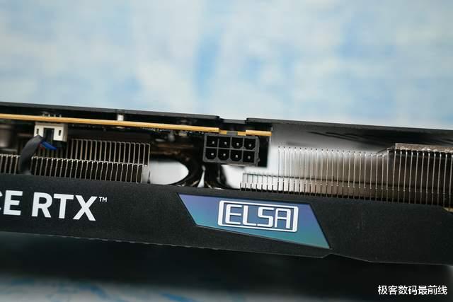 在背面这里,我们可以看到一块全金属的背板,上面有艾尔莎和RTX的LOGO,旁边是不规则的线条装饰,稳固之余还兼顾了显卡的个性。