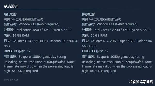 从官方公布的配置要求可以看到,《生化危机9》的最低配置是酷睿i5-8500处理器和GTX1660 6GB显卡,画质设定是640p像素渲染输出1080p/30fps,而推荐配置则是酷睿i7-8700处理器和RTX2060 Super 8GB,画质设定是720p像素渲染输出1080p/60fps,门槛看起来还算友好,但是实际的上限非常高,因为这里列举的配置才1080p分辨率,而且还不是1:1的分辨率渲染,加上游戏支持光追和路径追踪,想要爽玩并不简单,最好是使用支持DLSS4技术的50系显卡,这样就可以更好地保证到游戏的流畅度与画面体验。