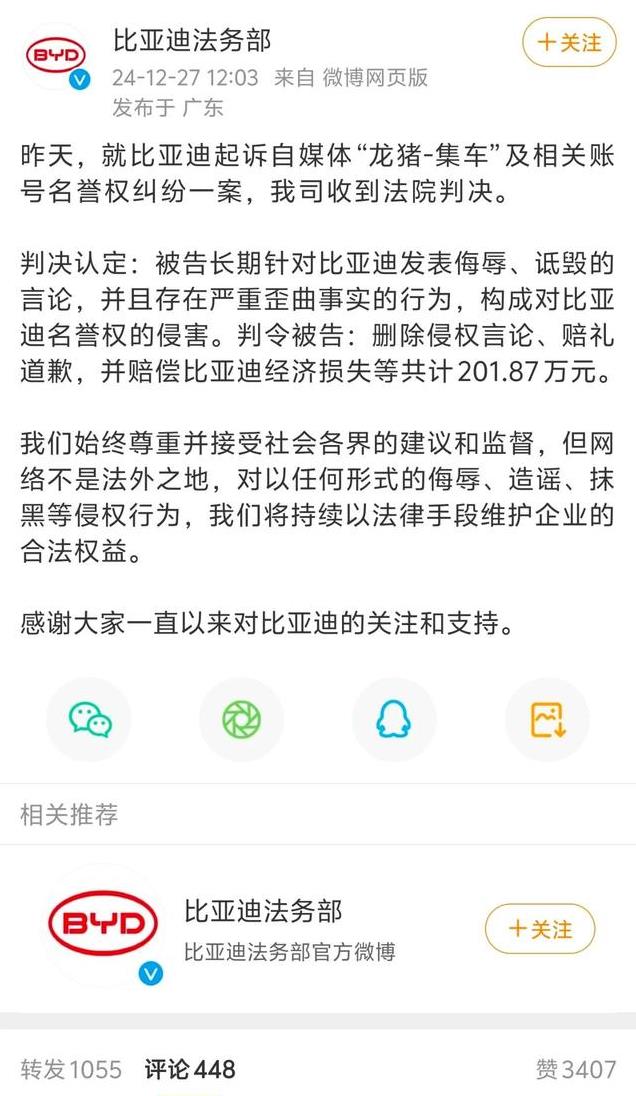 法院认定“龙猪-集车”及相关账号存在严重歪曲事实的行为,侵害了比亚迪的名誉权。