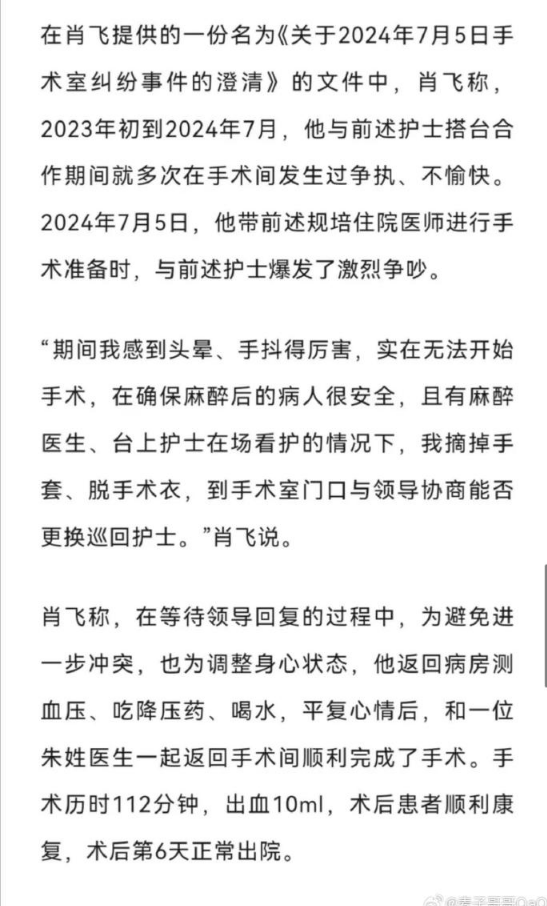 石某慧因婚外情两次怀孕流产,而董某莹于 2024 年怀孕后,肖飞更是租房与她同居打算离婚。更为严重的是医疗安全问题,2024 年 7 月 5 日的一场手术中,因董某莹操作失误被护士训斥,肖飞竟与护士争执后,将已麻醉患者留在手术台长达 40 分钟,带着董某莹离开现场。尽管肖飞事后以 “头晕、手抖” 需调整状态为由,强调患者最终安全,但这无法掩盖他对医疗安全的严重漠视,彻底触碰了职业底线。