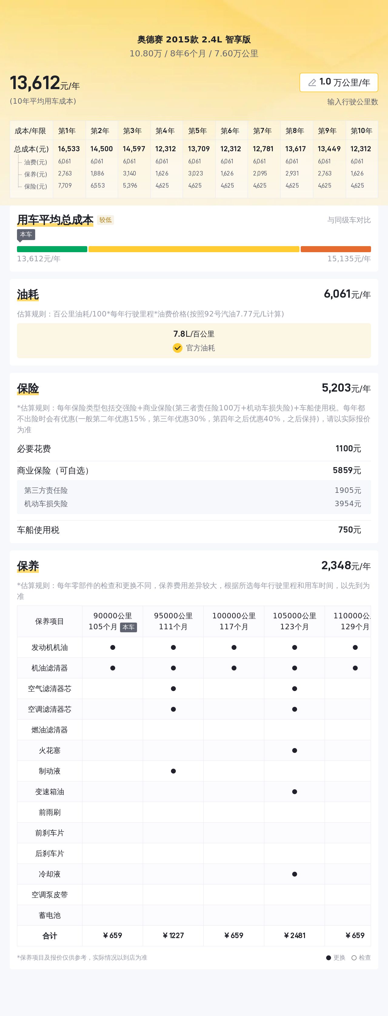 根据大数据预估显示,这辆车的市场价格在10.87万至13.67万之间。具体的价格因车辆的车龄、里程、过户次数等因素而异。作为懂车帝的合作车商,该车报价为10.8万,体现了车商的诚意和对市场的敏锐把握。在用车成本方面,这款车的百公里油耗为7.8L,按照当前油价计算,每百公里的油费大约为64元。此外,保险费用和保养费用也是一笔不小的开支。根据预估,每年的保险费用大约为4330元,而每年的保养费用则因使用强度和保养项目而异,但预计不会超过2000元。因此,总体来说,这款车的使用成本还是比较合理的,既能够满足日常使用的需求,又不会给车主带来过大的经济压力。