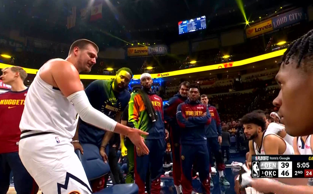 在第三节中段,场上出现不和谐一幕,掘金反击回合,约基奇和霍姆格伦纠缠到一起,霍姆格伦紧贴着约基奇,一路上对抗,这惹恼了约基奇,随后支肘将霍姆格伦推了个趔趄,动作幅度比较大!约基奇本场比赛虽然尽职尽力,但是心态很不好,第三节初段,约基奇朝着波特怒吼快点回防,还是被雷霆打出反击,随后约基奇直接无奈捂脸,嘴里念念有词!第二节中段,约基奇更是在替补席发怒:面对着场上队友一通比划,威少躲开到一边,其他人则直接被镇住,哑口无言。包括第四节约基奇直接打到多特后脑勺!