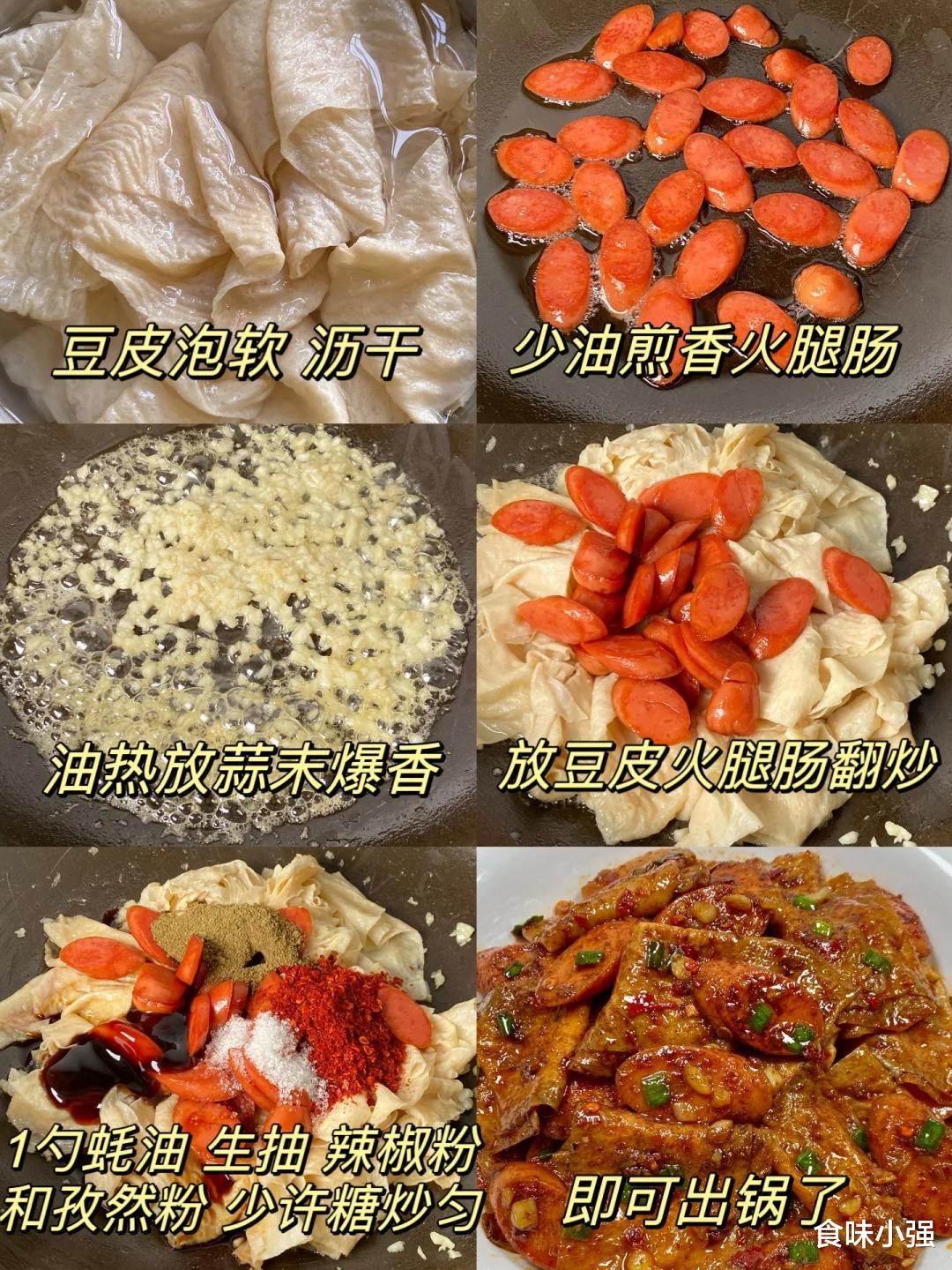 前段时间去亲戚家做客,头一次吃到这个菜,真的被惊艳到了,跟亲戚家学了好几次终于做成功了,今天我把这道菜的做法分享给大家,真的无敌超级好吃,豆腐皮吸慢了浓浓的酱汁,软嫩又有嚼劲,火腿肠外焦里嫩,香辣开胃又下饭。