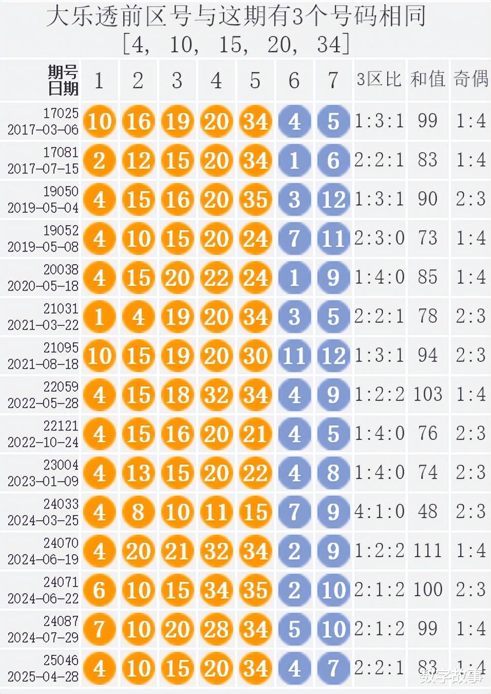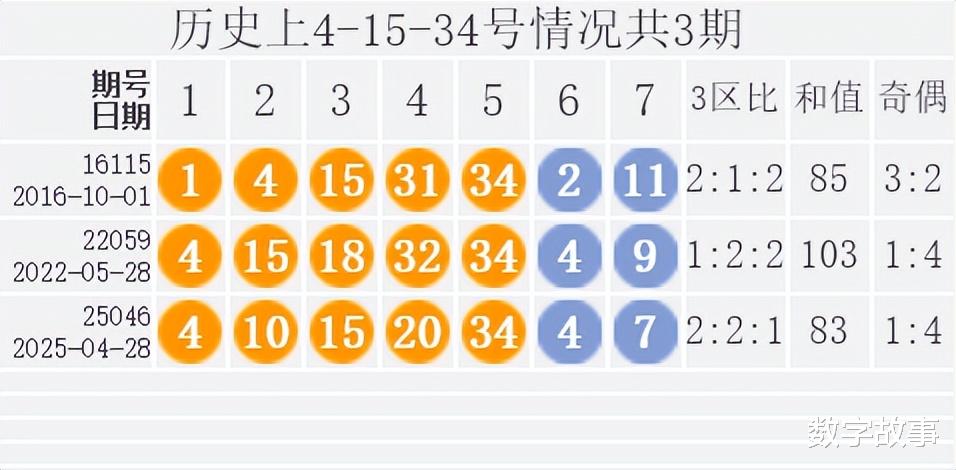 文末有大乐透前区号等差数10-15-20, 及4-15-34的历史统计。