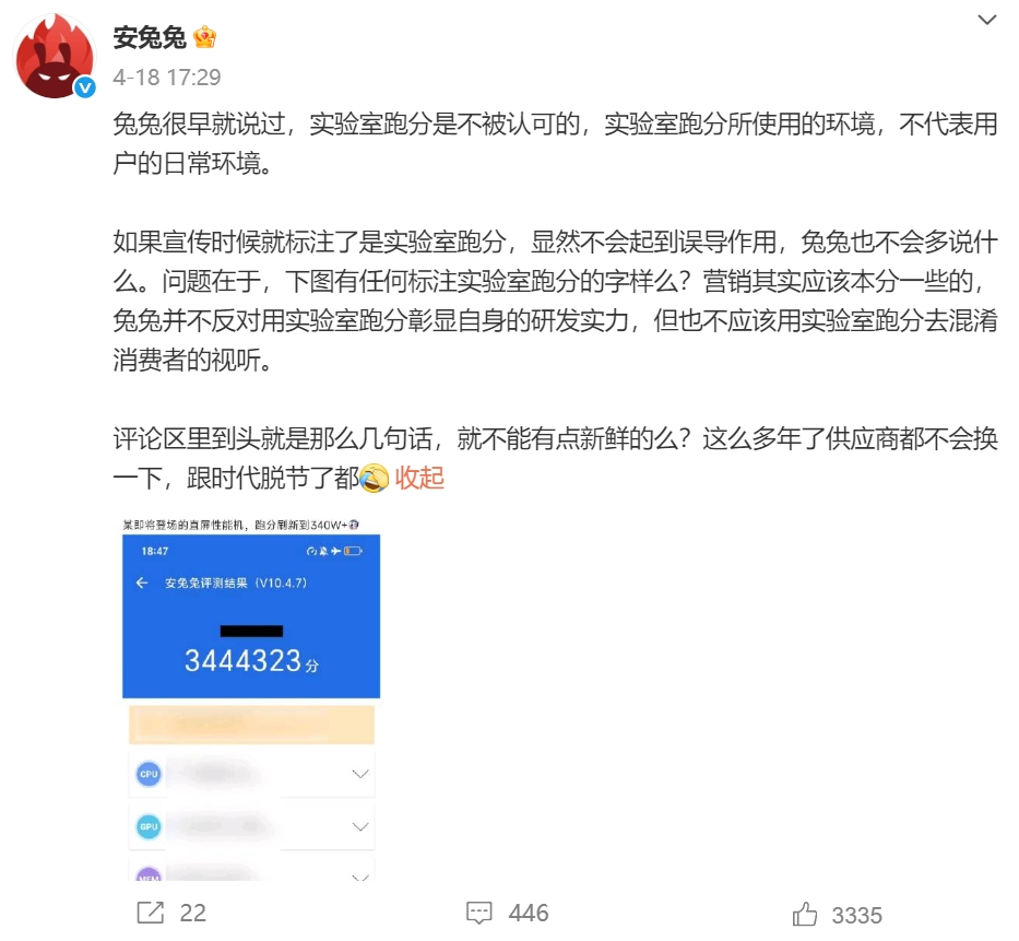 4月17日安兔兔官方发文称,340万的成绩都能编出来了,断网,还是低电量,BUFF叠满了这是,就真不怕用户入手了跑不到这个成绩要求退货吗?