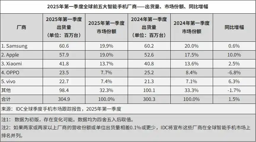 可以看到苹果处于中国市场第五,出货量980万台,这意味着荣耀手机在中国市场第一季度的出货量已经低于980万部。