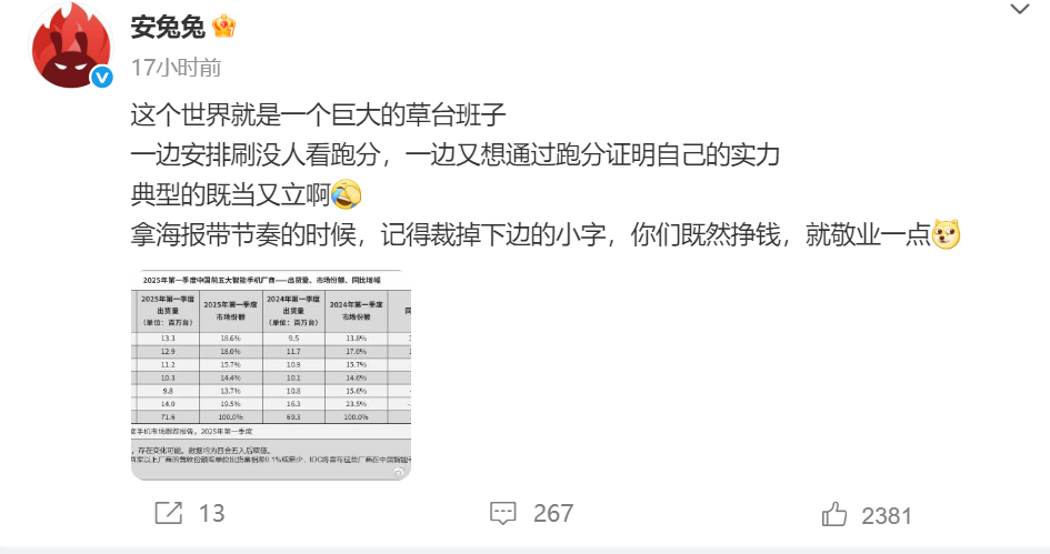 随后安兔兔又发表了多条言辞激烈的博文,表示一边安排刷没人看跑分,一边又想通过跑分证明自己的实力,典型的既当又立啊。拿海报带节奏的时候,记得裁掉下边的小字,你们既然挣钱,就敬业一点。