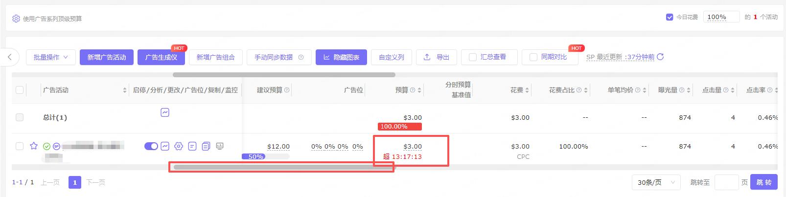 优麦云广告管理里的广告活动,在“今日花费100 %的活动”前打对号,页面就会显示出来已经超预算的广告活动,向右拉动至预算那一列,可以看到该广告活动在13:17:13的时候就已经超预算了。