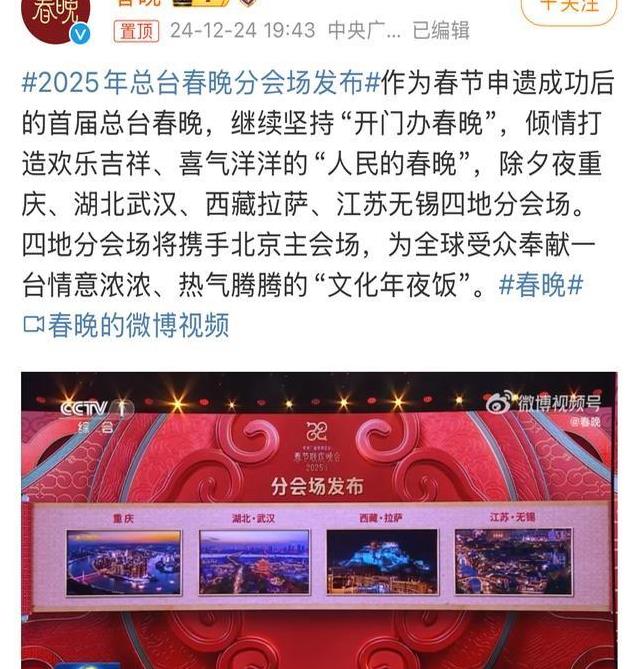 就在各界关注春晚节目单之际,总台传来重磅消息:2025年春晚将设立重庆、武汉、拉萨、无锡四个分会场。