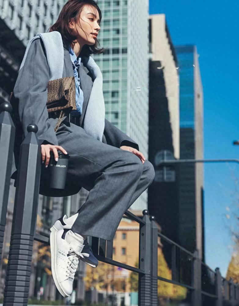 配西装也合适。西装容易太正式,换成运动鞋瞬间放松了。这种混搭挺时髦,上班休闲都能穿。