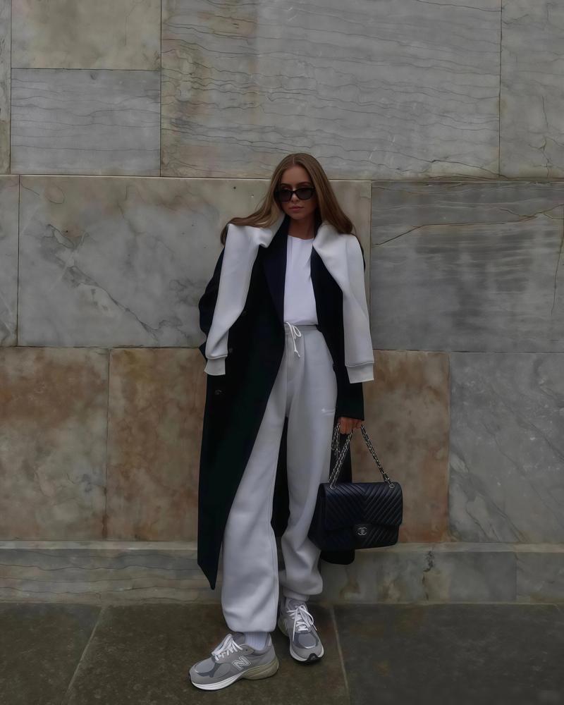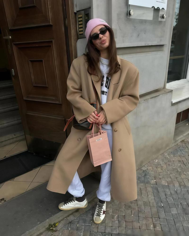 搭配长大衣很绝。大衣容易压个子,九分裤收住下摆,露出脚踝和运动鞋,整体就轻盈了。上重下轻,比例反而好。