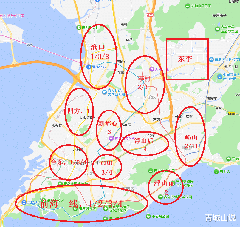 但通过上图会发现,青岛市区现在只有一个大片区还没有地铁,那就是东李。