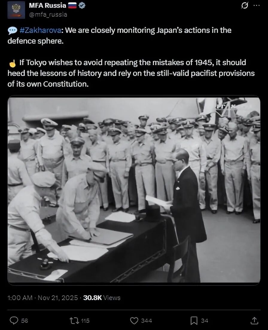 俄罗斯的反击更绝。千岛群岛演习不发预告,演完了才通报,还晒出日本投降书照片配文“历史不容篡改”。这不仅戳穿高市早苗否认二战历史的谎言,更用行动证明:《雅尔塔协定》早定了千岛群岛归属,俄军在这演戏,天经地义。