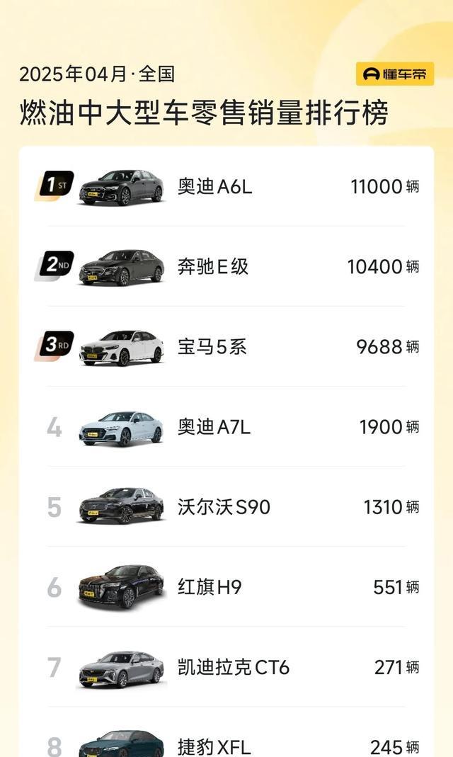 我们来看一组数据,2024年4月,燃油中大型轿车销量排名,奥迪A6L卖了11000辆,奔驰E级卖了10400辆,宝马5系卖了9688辆,而沃尔沃S90只卖了1310辆,排名第五。这差距,不是一般的大。沃尔沃想靠新款S90来个“弯道超车”,也是情理之中的事。