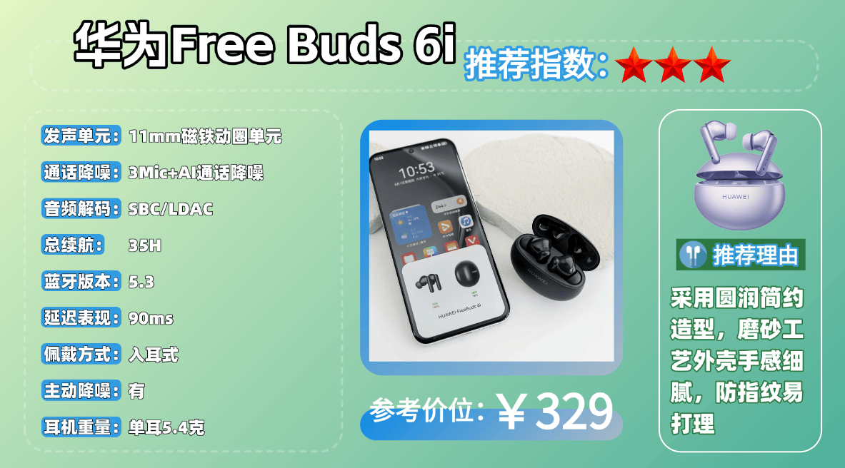 综合主流机型5、华 为F ree Buds 6i蓝牙耳机