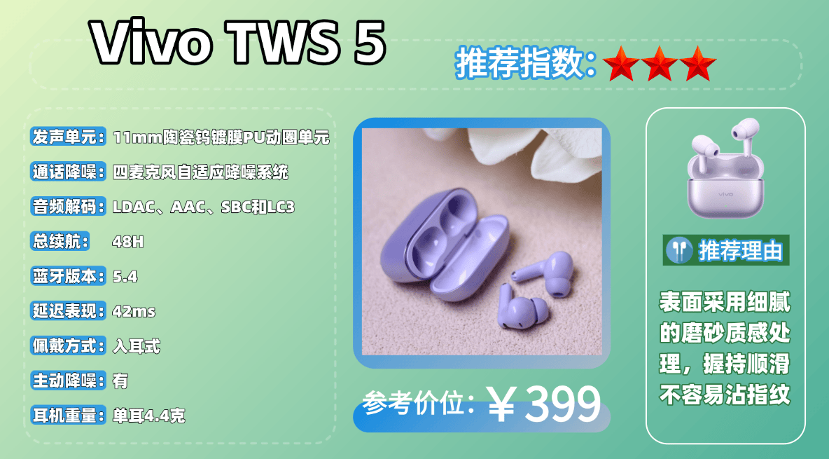 综合主流机型10、V ivo T WS 5蓝牙耳机